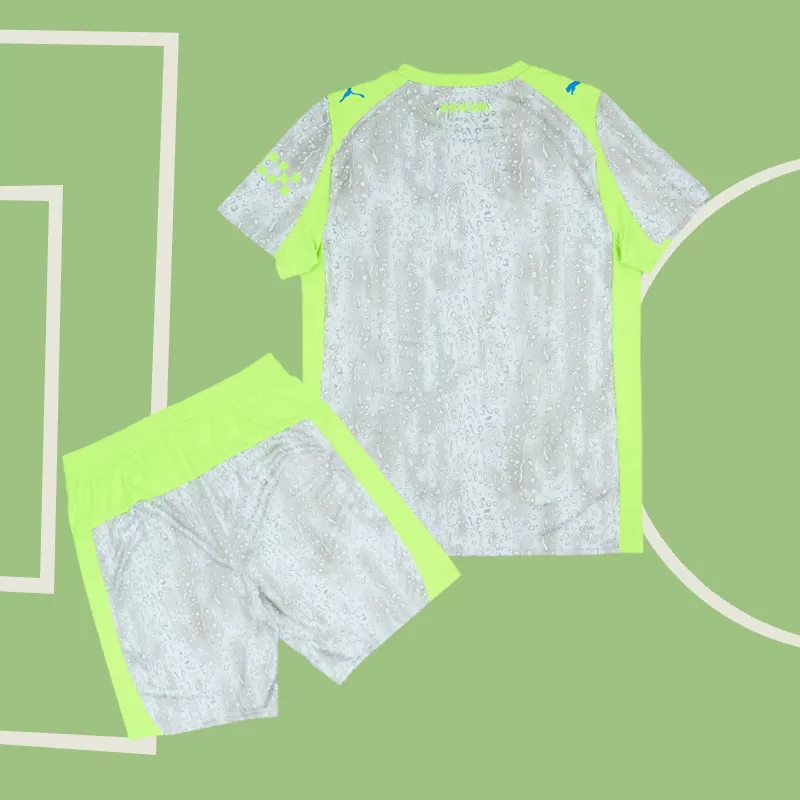Manchester City tretji dres 2025/26 je zasnovan za mlade navijače, ki želijo igrati in navijati v istem stilu kot njihovi junaki. Otroški nogometni komplet vključuje majico in hlače z modernim potiskom, ki spominja na kapljice dežja, poudarjenim z živahnimi zelenimi detajli na ovratniku, ramenih in straneh. Na hrbtni strani je prostor za personalizacijo, zato lahko dodate ime in številko najljubšega igralca, kot sta Haaland ali De Bruyne. Ta komplet je lahek, udoben in popoln za igro ali nošenje na tribuni. Otroški Manchester City nogometni dres 2025/26 je na voljo z možnostjo hitre dostave, zato je odlična izbira za vse mlade nogometaše in prave navijače.