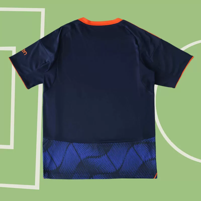 Nottingham Forest 2025/26 moški tretji nogometni dres – kratka majica je zasnovan v sodobnem videzu z elegantno temno modro osnovo in grafičnim valovitim vzorcem na sprednji strani. Kontrastni rdeči detajli na ovratniku in rokavih dodajo energijo ter poudarijo prepoznavni slog kluba. Ta nogometni dres je lahek, udoben in primeren tako za igro kot za navijače, ki želijo izstopati na tribunah.